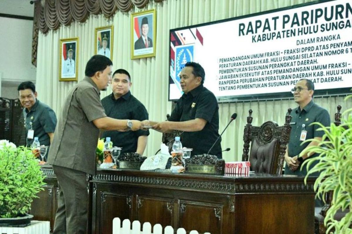 DPRD Kabupaten Hulu Sungai Selatan (HSS), Kalimantan Selatan (Kalsel), menggelar rapat paripurna agenda rangka pandangan umum fraksi-fraksi terhadap Rancangan Peraturan Daerah (Raperda) tentang perubahan atas Perda Nomor 6 Tahun 2020 tentang pembentukan dan susunan perangkat daerah.