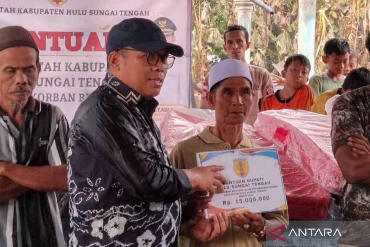 Wakil Bupati Hulu Sungai Tengah (HST), Kalimantan Selatan, H Gusti Rosyadi Ilmi bersama jajaran Dinas Sosial dan Badan Penanggulangan Bencana Daerah (BPBD) HST menyerahkan bantuan darurat kepada para korban kebakaran di Desa Cukan Lipai, Kecamatan Batang Alai Selatan.