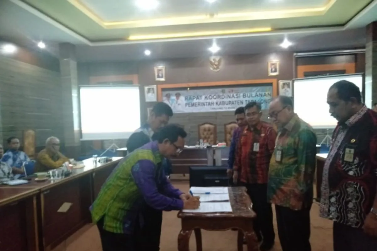 Penandatanganan surat perjanjian kerjasama penyusunan dokumen ZNT antara Kepala BPPRD dan Kantor Pertanahan disaksikan Bupati Tabalong Anang Syakhfiani dan Sekda Abdul Mutjalib Sangadji.