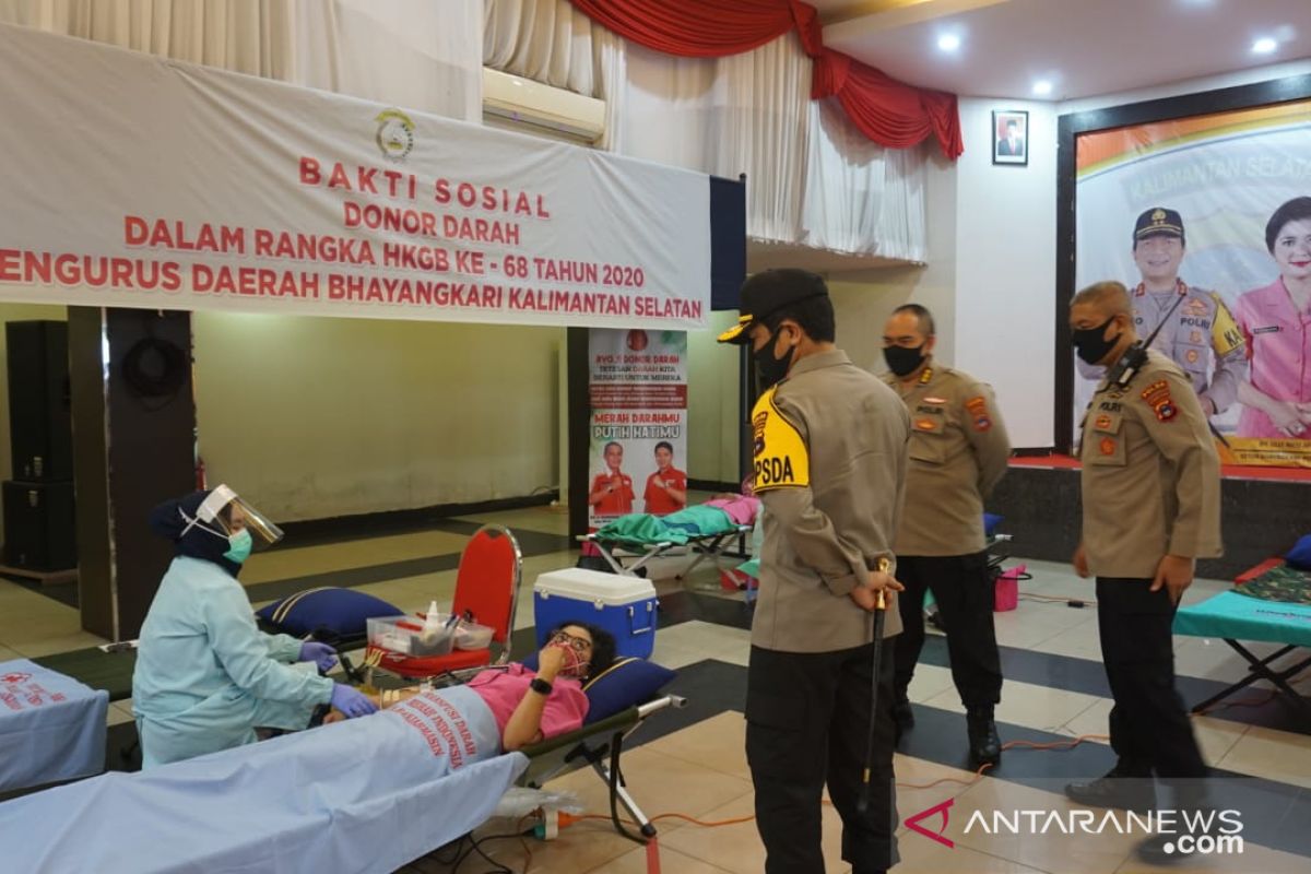 Banjarmasin (ANTARA) - Polda Kalimantan Selatan menggelar bhakti sosial kesehatan donor darah dalam rangka Hari Bhayangkara ke-74 serta Hari Kesatuan Gerak Bhayangkari (HKGB) ke-68 di Aula Bhayangkari Mathilda Batlayeri, Jumat.