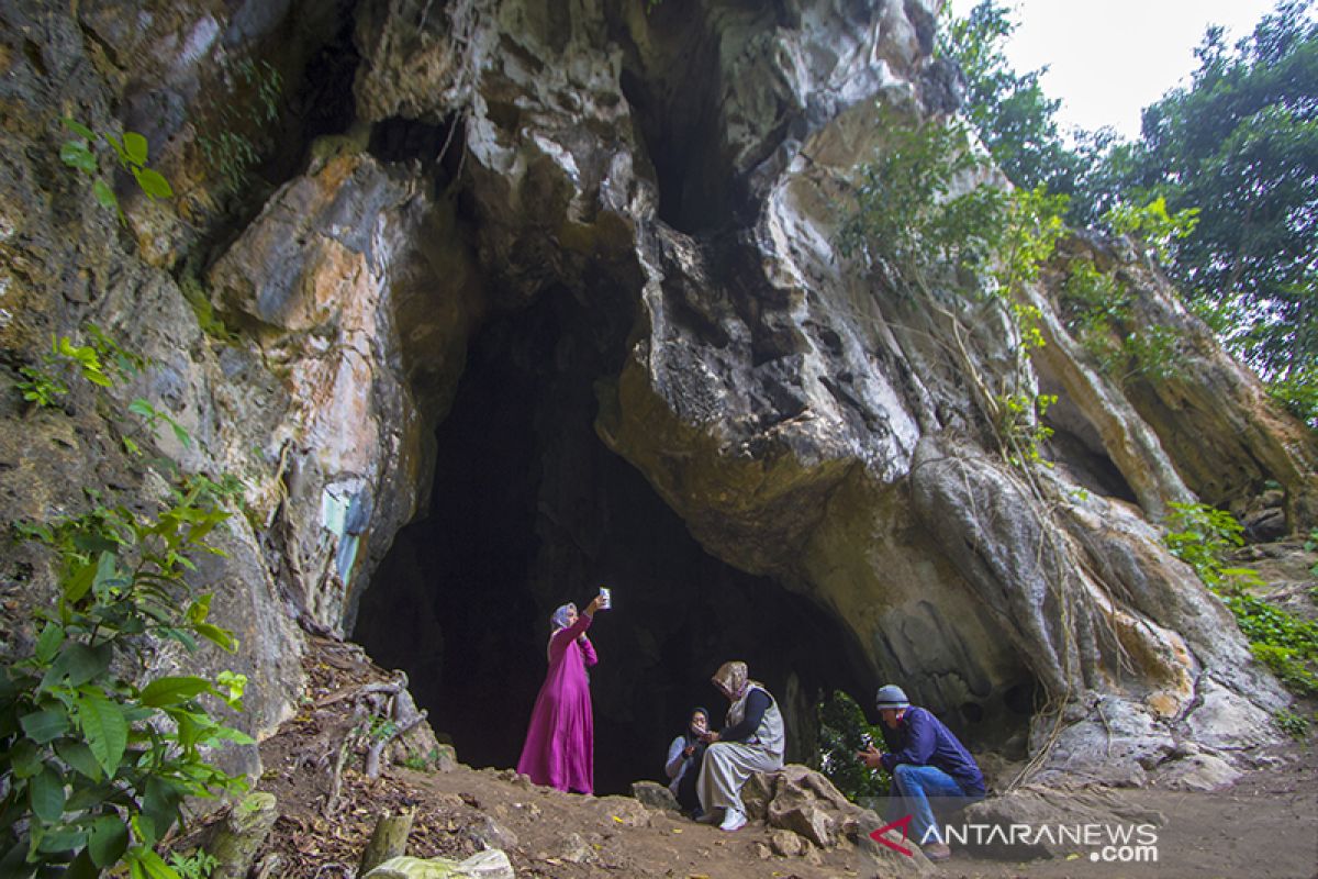 Wisatawan menikmati keindahan alam di Goa Lowo di Desa Tegalrejo, Kabupaten Kotabaru, Kalimantan Selatan, Kamis (26/11/2020). Goa alam tersebut selain menawarkan keindahan alam juga menawarkan jalur yang cukup menantang bagi wisatawan yang hendak ke puncak Goa tersebut serta ditunjang berbagai macam fasilitas wisata lainnya yang dikelola oleh kelompok sadar wisata (pokdarwis) setempat dengan harga tiket masuk sebesar Rp5.000 per orang. Foto Antaranews Kalsel/Bayu Pratama S.
