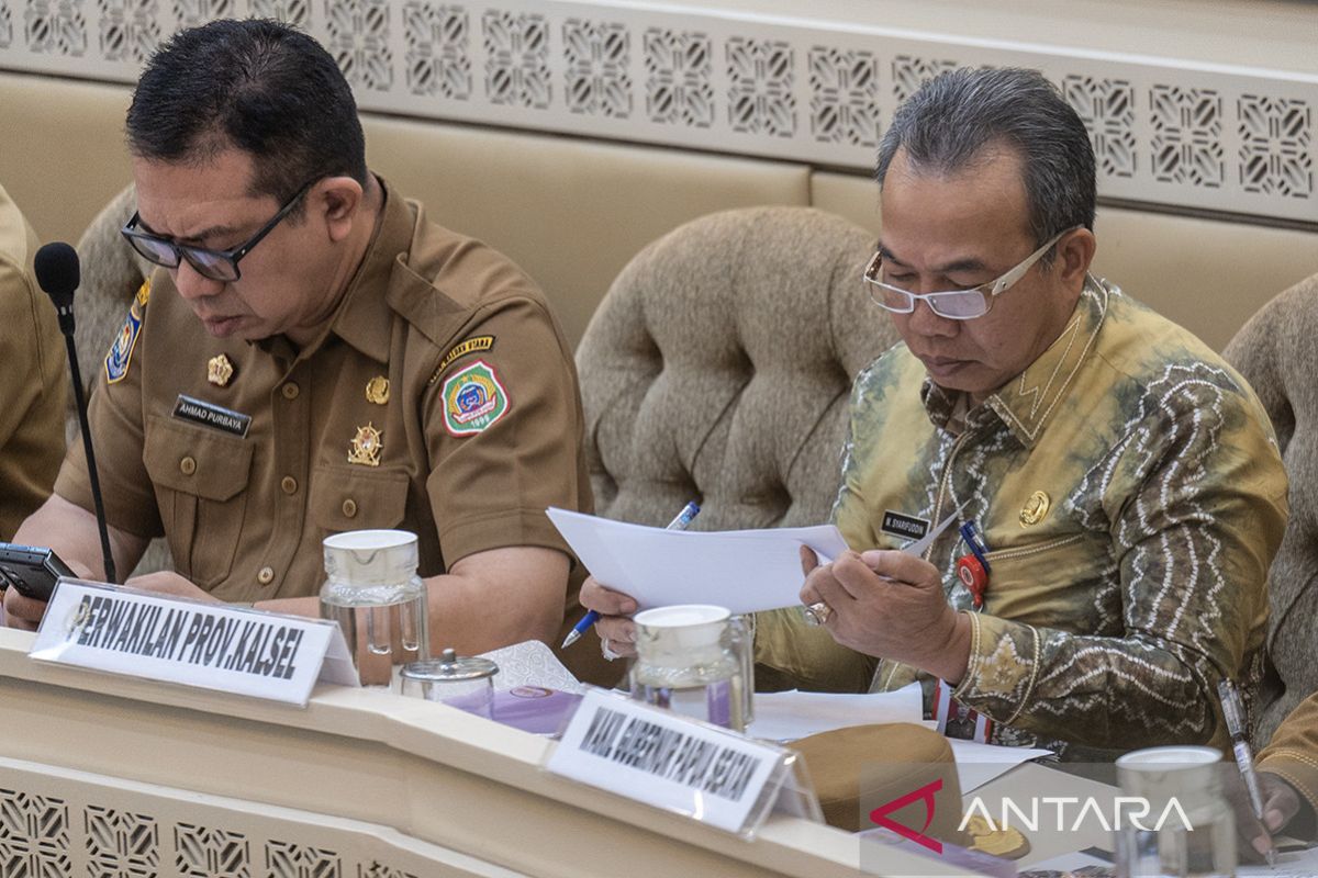 Pelaksana Tugas Sekretaris Daerah Provinsi Kalimantan Selatan (Plt Sekdaprov Kalsel) Muhammad Syarifuddin (kanan) mengikuti Rapat Dengar Pendapat (RDP) Komisi II DPR dengan Kementerian Dalam Negeri dan Gubernur seluruh Provinsi di Kompleks Parlemen, Senayan, Jakarta, Senin (28/4/2025). Rapat tersebut beragendakan pembahasan terkait penyelenggaraan pemerintah daerah salah satunya dana transfer pusat ke daerah. ANTARA/Bayu Pratama S
