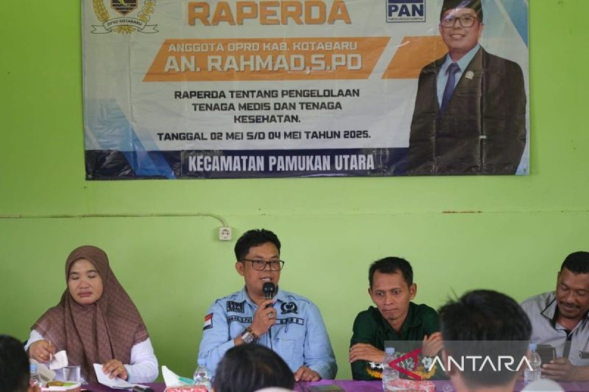 Kotabaru (ANTARA) - Anggota DPRD Kotabaru Kalimantan Selatan Rahmad mensosialisasikan Rancangan Peraturan Daerah (Raperda) inisiatif tentang Pengelolaan tenaga medis dan tenaga kesehatan di dua kecamatan Kecamatan Pamukan Utara dan Sampanahan