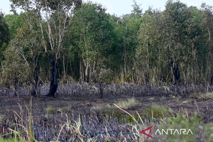 Meskipun api sudah padam, kepulan asap masih terlihat dan beberapa titik masih terdapat bara api yang sempat melahap rumput liar dan ilalang.
