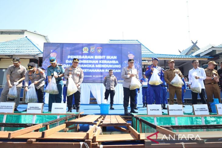Banjarmasin (ANTARA) - Direktorat Polisi Perairan dan Udara (Ditpolairud) Polda Kalimantan Selatan menebar sebanyak 100 ribu bibit ikan mas untuk mendukung program ketahanan pangan melalui bantuan enam keramba apung kepada masyarakat di pesisir sungai Martapura di kawasan Teluk Tiram Laut, Kota Banjarmasin.