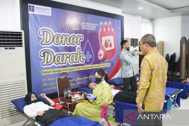 Banjarmasin (ANTARA) - Dalam rangka memperingati Hari Pengayoman ke-80 Tahun 2025, Kantor Wilayah Kementerian Hukum Kalimantan Selatan menyelenggarakan kegiatan donor darah di Balai Pertemuan Garuda yang dijadikan semangat berbagi.