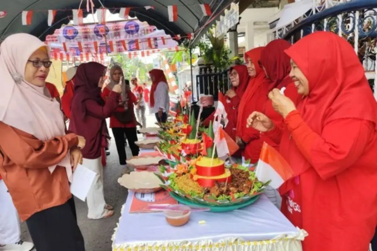 Lurah Pemurus Dalam Kota Banjarmasin Shelleya Dessesta (kiri) menilai lomba nasi tompeng pada peringatan HUT ke-80 Kemerdekaan RI di RT43 Kelurahan Pemurus Dalam, Ahad (17/8/2025). (ANTARA/HO-Antara Biro Kalsel)