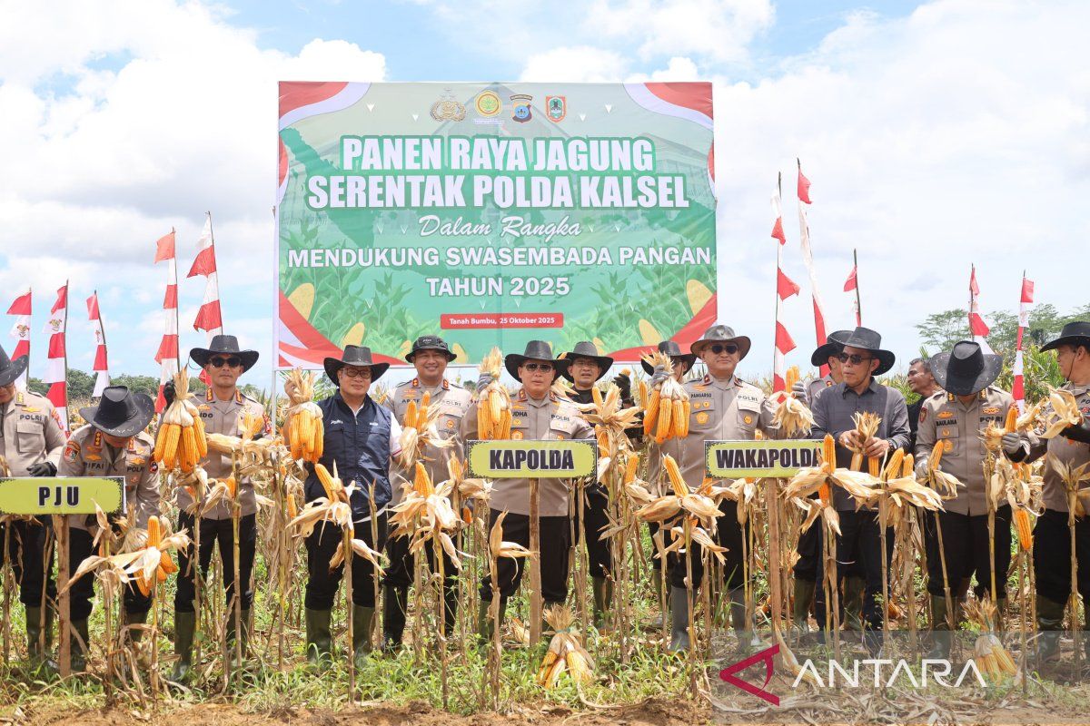 Diketahui Polda Kalsel melaksanakan panen raya serentak jagung sebanyak 162 ton hasil tanam program ketahanan pangan.