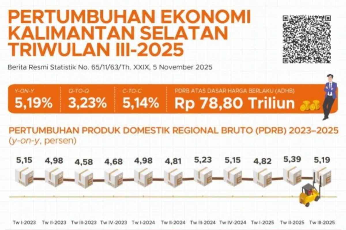 “Pertumbuhan ekonomi Kalimantan Selatan pada Triwulan III-2025 mencapai 5,19 persen (y-on-y). Dari 17 lapangan usaha, sebanyak 15 mengalami pertumbuhan positif,” ujar Kepala BPS Provinsi Kalsel Mukhamad Mukhanif dikonfirmasi di Banjarmasin, Kamis.