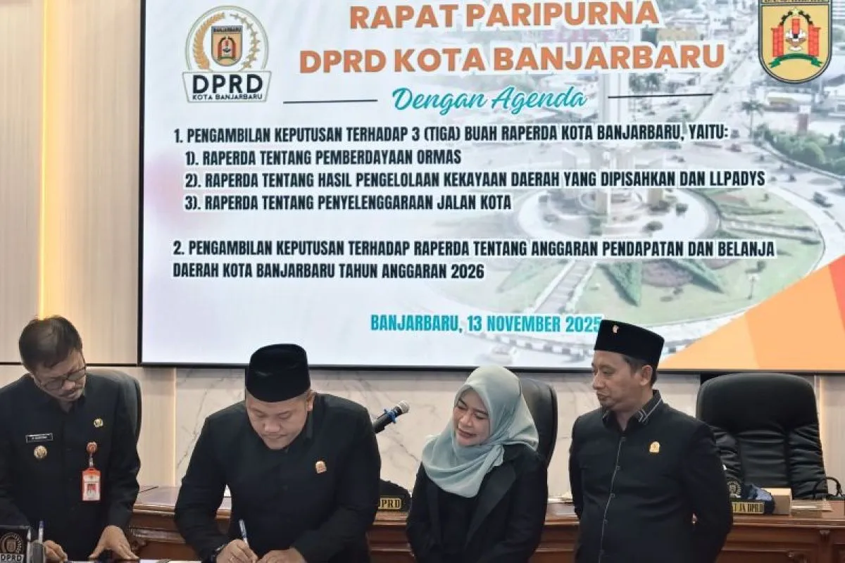 Banjarbaru (ANTARA) - Dewan Perwakilan Rakyat Daerah (DPRD) Kota Banjarbaru, Kalimantan Selatan (Kalsel), mengesahkan Peraturan Daerah (Perda) tentang Anggaran Pendapatan dan Belanja Daerah (APBD) Tahun 2026 bersama tiga perda inisiatif lainnya.
