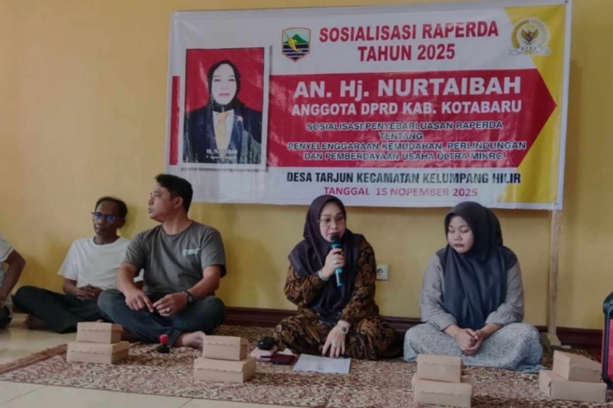 Kotabaru, Kalsel (ANTARA) - Anggota DPRD Kabupaten Kotabaru Provinsi Kalimantan Selatan Nurtaibah sosialisasi Rancangan Peraturan Daerah (Rperda) tentang penyelenggaraan kemudahan perlindungan dan pemberdayaan usaha ultra mikro tahun 2025 di Desa Tarjun Kecamatan Kelumpang Hilir.