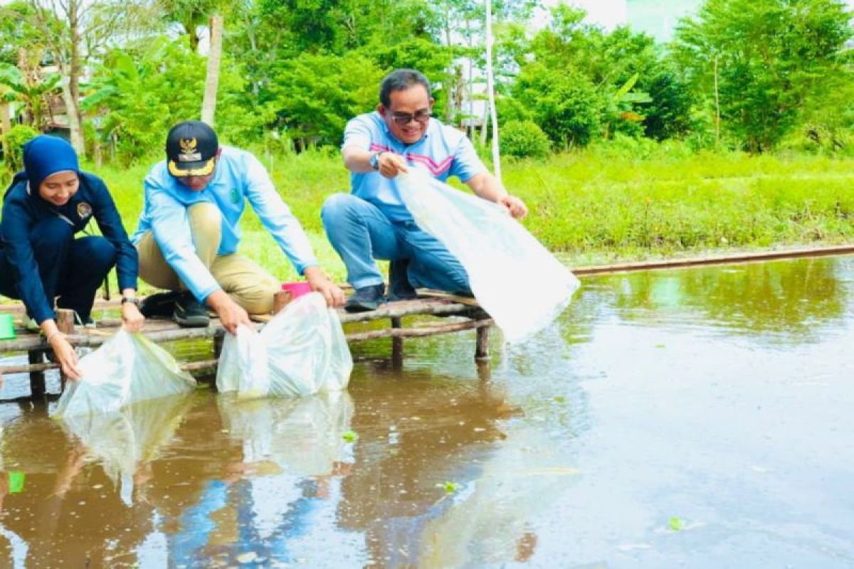 Amuntai (ANTARA) - Bupati Hulu Sungai Utara (HSU), Kalimantan Selatan Sahrujani bersama Wakil Bupati HSU Hero Setiawan menebar bibit ikan air tawar di alam dan bantuan sarana perikanan bagi masyarakat di Desa Banyu Tajun Dalam, Kecamatan Sungai Pandan, Jumat.