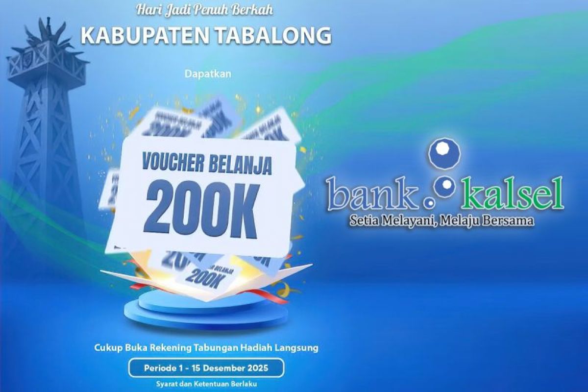 Banjarmasin (ANTARA) - Bank Kalsel memberikan voucher belanja senilai Rp200.000 bagi setiap nasabah yang membuka rekening selama periode 1–15 Desember 2025 guna memeriahkan Hari Jadi ke-60 Kabupaten Tabalong.