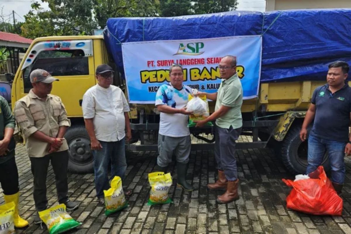 Manajemen PT Surya Langgeng Sejahtera menyerahan simbolis bantuan ratusan paket sembako bagi warga di dua kecamatan terdampak banjir di Kalumpang dan Simpur, Hulu Sungai Selatan, Kalimantan Selatan, Sabtu (10/1/2025) (ANTARA/HO-Antara Biro Kalsel)