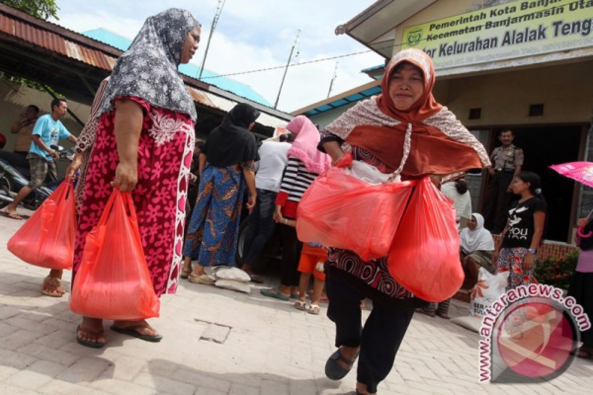 Seorang membawa beras yang dibelinya saat operasi pasar di halaman kantor Kelurahan Alalak Tengah Banjarmasin, Kamis (26/2). Bulog Kalsel dan Disperindag Banjarmasin menggelar operasi pasar beras sebanyak 5 ton di dua tempat untuk menekan lonjakan ha