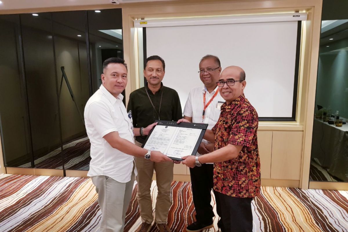Kepala Dinas Perhubungan Kabupaten Tabalong Imam Fahrullazi menerima sertifikat Bandar Udara (SBU) Tanjung Warukin dari perwakilan Dirjen Perhubungan Udara Agus Pramuka disaksikan perwakilan PT Pertamina, Tengku Mirza dan Manager Operasional PT Pelita air Aswin. Foto Antaranewa.Kalsel/ist (Istimewa)