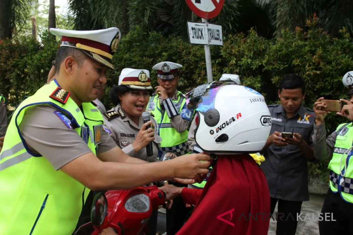 Banjarmasin, (Antaranews Kalsel) - Direktur Lalu Lintas (Dirlantas) Polda Kalsel Kombes Pol E Zulpan memimpin langsung bagi-bagi helm standar kepada pengendara di perempatan traffic light Jalan Lambung Mangkurat Banjarmasin, Rabu siang.