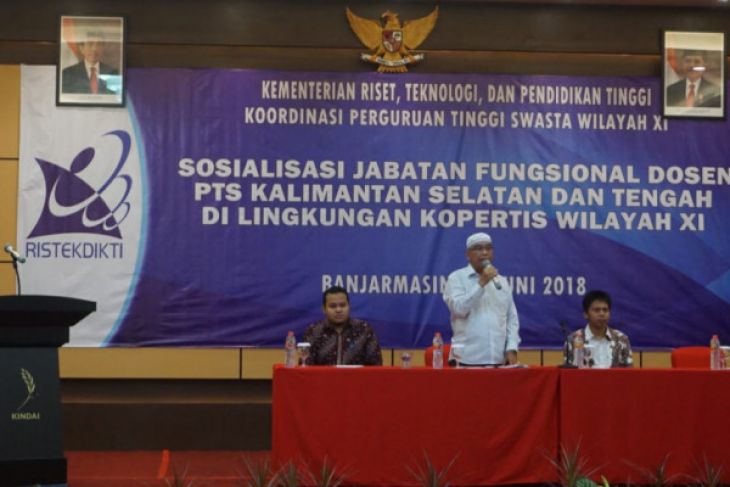 Banjarmasin, (Antaranews Kalsel) - Dalam rangka peningkatan pengetahuan dan pemahaman tentang jabatan karier dosen, koordinasi Wilayah XI Kalimantan melaksanakan Sosialisasi Jabatan Fungsional Dosen PTS Kalimantan Selatan dan Tengah di Banjarmasin, Kamis (28/7).