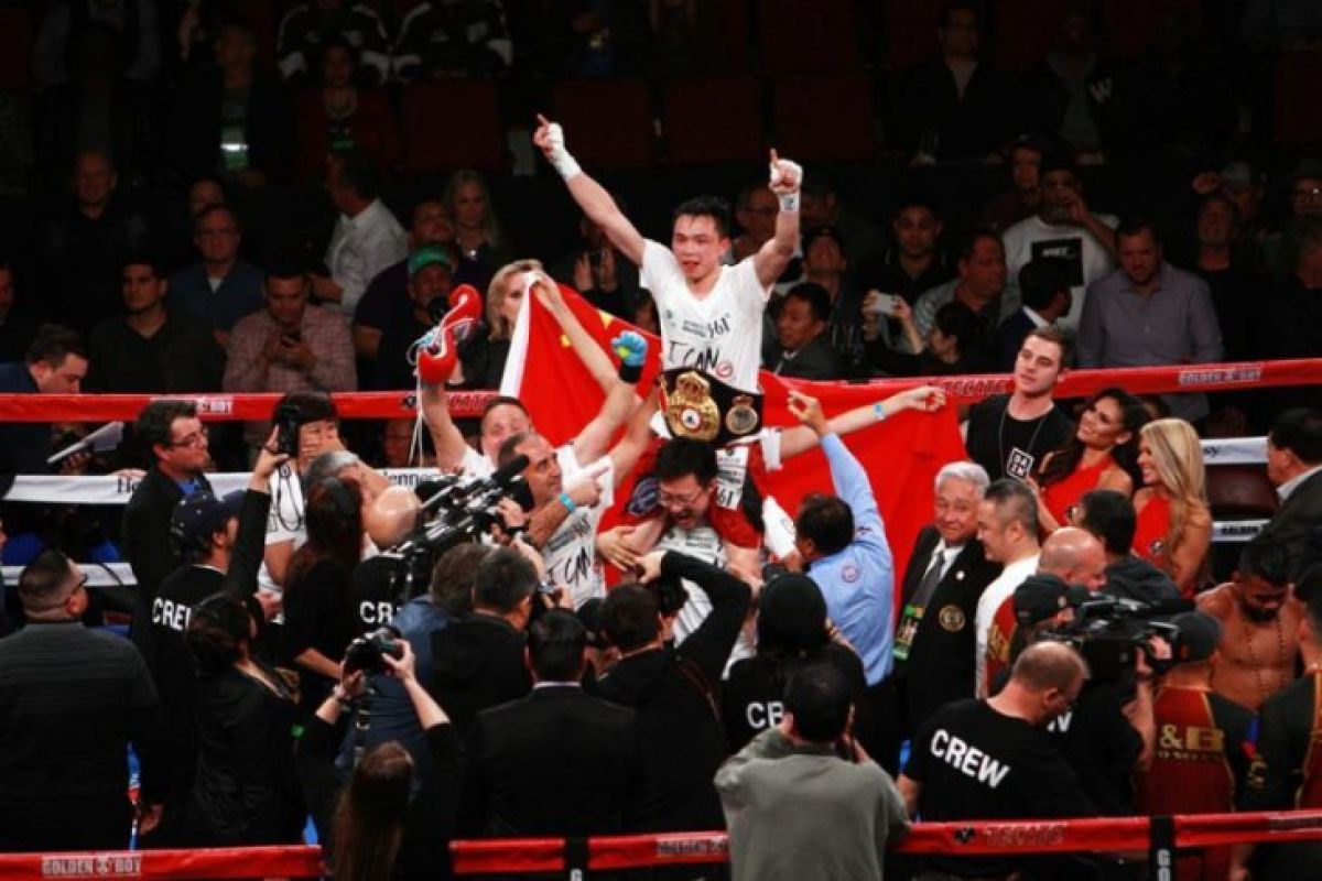 Xu Can merayakan keberhasilannya meraih sabuk juara dunia tinju kelas bulu versi WBA di Houston, Texas, Sabtu (26/01/2019) (Xinhua/Zhong Jia) (Antaranews.com)
