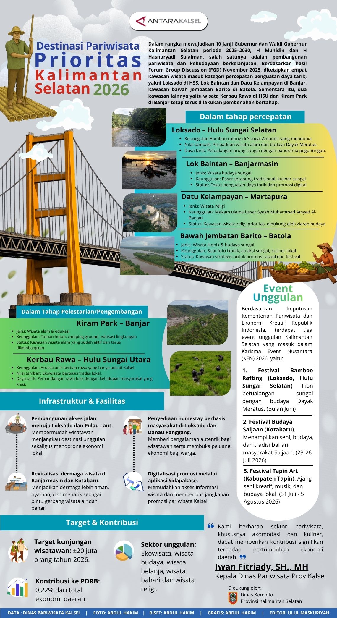 Dalam rangka mewujudkan 10 Janji Gubernur dan Wakil Gubernur Kalimantan Selatan periode 2025–2030, H Muhidin dan H Hasnuryadi Sulaiman, salah satunya adalah pembangunan pariwisata dan kebudayaan berkelanjutan. Berdasarkan hasil Forum Group Discussion (FGD) November 2025, ditetapkan empat kawasan wisata masuk kategori percepatan penguatan daya tarik, yakni Loksado di HSS, Lok Baintan dan Datu Kelampayan di Banjar, kawasan bawah Jembatan Barito di Batola. Sementara itu, dua kawasan lainnya yaitu wisata Kerbau Rawa di HSU dan Kiram Park di Banjar tetap terus dilakukan pembenahan bertahap.